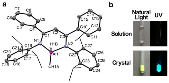(a) Oak Ridge Thermal Ellipsoid Plot (ORTEP) (50% ellipsoids) of compound LAlH. For clarity, isopropyl groups were shown in wireframe and hydrogen atoms were omitted except for those at the aluminum atom. Key to atom colors: carbon, gray; aluminum, magenta; nitrogen, blue; and hydrogen, white. (b) Photographic images of the 2-methylpentane/toluene (99/1) solution (1 × 10−5 M) and the crystals under natural light (left) and UV irradiation (right).