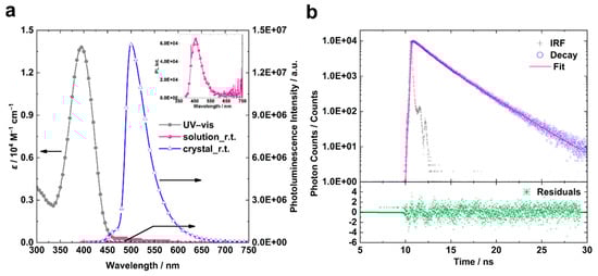 (a) UV–vis spectrum in 1 × 10−5 M 2-methylpentane/toluene (99/1, v/v) solution (gray, –●–), and photoluminescence spectra in the solution (magenta, –○–) and in the crystalline states (blue, –∆–). Inset shows an enlarged view of the photoluminescence spectrum in the solution state (magenta, –○–). (b) A photoluminescence decay curve (blue, ○) in the crystalline state at room temperature is shown with an instrument response function (gray, +), an exponential fitting curve (magenta, −), and residuals of the fitting (green, ×).