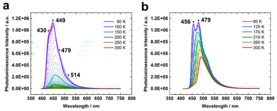 Temperature dependence of photoluminescence spectra of (a) the solution and (b) the crystals. Temperature increments were 5 and 15 K for the solution and the crystalline samples, respectively.