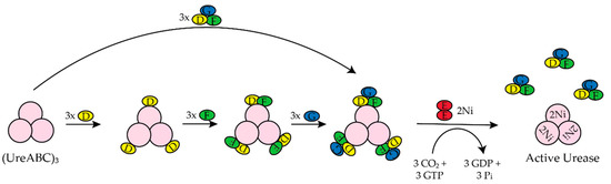 A simplified scheme of K. aerogenes urease activation [20,27,28]. The trimer of trimers (UreABC)3 sequentially binds UreD, UreF, UreG or the UreDFG complex. The isolated UreDFG complex contains two UreD, UreF, and UreG promoter but only one monomer is shown for simplicity. Lys 217 is carbamylated by CO2, GTP is hydrolyzed by UreG, and nickel is delivered by UreE to form the active enzyme and the UreDFG proteins are released.