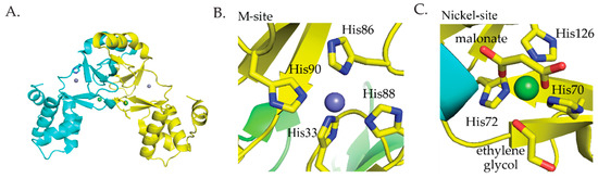 (A) The crystal structure of S. coelicolor Nur (PDB ID 3EYY) [62]. The monomers are colored cyan and yellow. Zinc ions and nickel ions are shown as slate spheres and green spheres, respectively. (B) Close-up of the M-site. (C) Close-up of the Ni-site. (Figure adapted with permission from Higgins, K.A.; Carr, C.E.; Maroney, M.J. Specific Metal Recognition in Nickel Trafficking. Biochemistry 2012, 51, 7816–7832. Copyright (2012) American Chemical Society.).