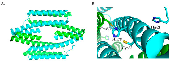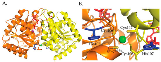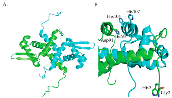 Crystal structure of HypA from T. kodakarensis [99]. The protein monomers are shown in cyan and green and the zinc ion is shown as a slate sphere. (A) The zinc site from the monomeric protein (PDB ID 3A43) [99]. (B) Crystal structure of the domain swapped dimer (PDB ID 3A44) [99]. (Figure adapted with permission from Higgins, K.A.; Carr, C.E.; Maroney, M.J. Specific Metal Recognition in Nickel Trafficking. Biochemistry 2012, 51, 7816–7832. Copyright (2012) American Chemical Society).