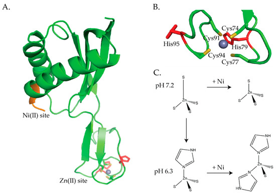 NMR structure of H. pylori HypA at pH 7.2 (PDB ID 6G81) [100]. HypA was expressed in growth medium containing zinc sulphate and purified as ZnHypA [100]. (A) The nickel binding MHE residues are in orange and the zinc site is shown at the base of the protein where the zinc ion is coordinated by 4S-donors forming a tetrahedral zinc site. The histidine residues flanking the CXXCXnCXXC motif are shown in red. (B) Close-up of the zinc site. (C) Scheme depicting the changes in the zinc site when the pH changes and nickel binds to HypA. (This scheme is adapted with permission from Herbst, R.W.; Perovic, I.; Martin-Diaconescu, V.; O’Brien, K.; Chivers, P.T.; Pochapsky, S.S.; Pochapsky, T.C.; Maroney, M.J. Communication between the zinc and nickel sites in dimeric HypA: metal recognition and pH sensing. J. Am. Chem. Soc. 2010, 132, 10338–10351. Copyright (2010) American Chemical Society).