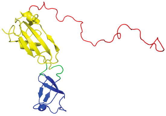 NMR structure of E. coli SlyD (PDB ID 2KFW) [126]. The IF domain is colored blue, the PPIase domain is colored yellow, and the unstructured C-terminal metal-binding tail is colored red.