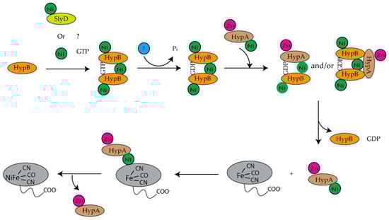 - Maier, T.; Lottspeich, F.; Böck, A. GTP hydrolysis by HypB is essential for nickel insertion into hydrogenases of Escherichia coli. Eur. J. Biochem. 1995, 230, 133–138. [Google Scholar] [CrossRef]