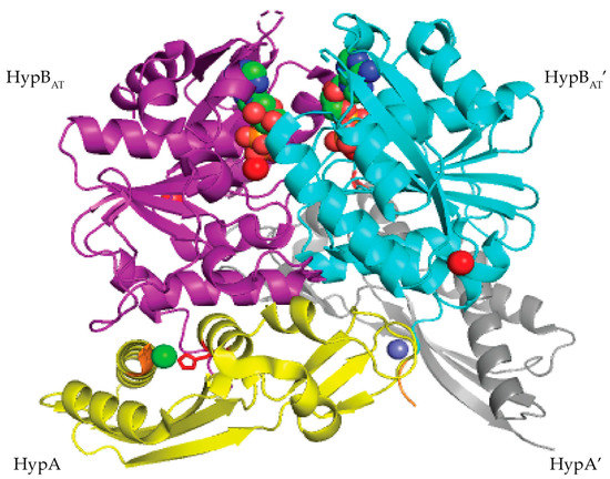 Crystal structure of the transient HypAB complex from T. kodakarensis (PDB ID 5AUN) [101]. The protein was crystallized from a solution containing equal molar concentrations of T. kodakarensis HypA and HypB in the presence of ATPγS and nickel chloride. The HypA monomers (shown in yellow and gray) bind on either site of the HypB dimer (shown in purple and cyan). The nickel ion is shown as a green sphere and is coordinated by the MHE motif (colored orange) and His98 (colored red) of HypA. The zinc ion is shown as a slate sphere, the magnesium ion as a red sphere, and the ADP molecules are shown as red, green, and blue spheres. (This figure is adapted from Watanabe, S.; Kawashima, T.; Nishitani, Y.; Kanai, T.; Wada, T.; Inaba, K.; Atomi, H.; Imanaka, T.; Miki, K. Structural basis of a Ni acquisition cycle for [NiFe] hydrogenase by Ni-metallochaperone HypA and its enhancer. Proc. Natl. Acad. Sci. USA 2015, 112, 7701–7706. Copyright (2015) National Academy of Sciences).