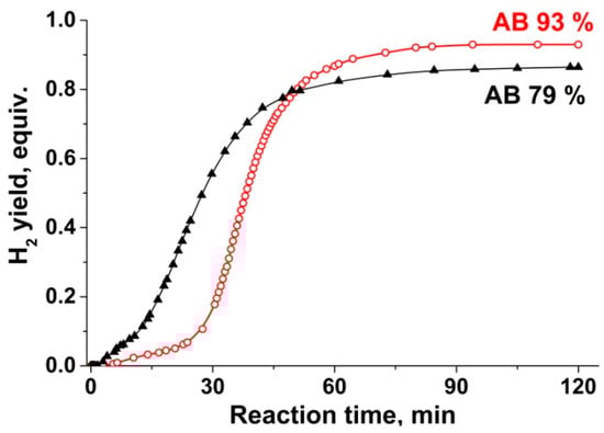 Despite the fact that ammonia borane is considered to have the highest air moisture stability among hydrides, it still decomposes slowly when stored for many years. Our experience shows that, in a closed container, its purity decreases by about 1% annually (based on observations over 12 years). Figure 1 shows the kinetic curves of hydrogen release from the AB sample with 93% purity, as well as the stored AB sample with 79% purity. The experiment was performed under isothermal conditions at the temperature of the external heating of the reactor of 100 °C. The thermolysis of AB under such conditions has been well-studied [14,15,16,17,18]. Its dehydrogenation occurs by stage (1) and shows an induction period, characteristic of topochemical processes, during which destabilization of dihydrogen bonds of the AB crystal lattice takes place, as well as melting of AB and its isomerization to diammoniate diborane (DADB), and the nucleation and growth of the new phase of polyaminoborane. As expected, the yield of hydrogen from the AB 79% sample was smaller than that from the AB 93% sample. Moreover, the induction period for the less pure sample (AB 79%) was considerably shorter, which allowed us to suggest that the products of its decomposition during storage accelerated formation of the DADB phase, which then acted as an initiator of AB dehydrogenation.