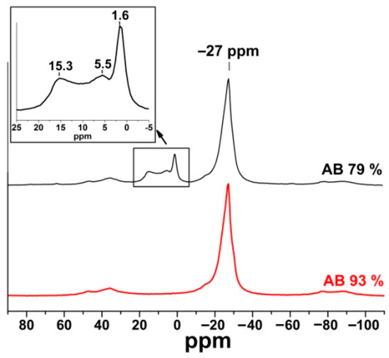 The ammonia borane samples were studied by ATR FTIR spectroscopy and 11B MAS NMR. The 11B MAS NMR spectra are shown in Figure 2. It is seen that both samples show an intense peak at −27 ppm, which is in good agreement with the data for ammonia borane given in the literature [2,18]. In the spectrum of the stored AB, there are additional peaks at 0–20 ppm, characteristic of borate anions. The narrow signal at ca. 2 ppm refers to four-coordinated boron atoms, BO4. Broader components at low field shows a typical lineshape, arising from the central transition perturbed by second-order quadrupolar interactions that cannot be averaged under magic angle spinning conditions. This resonance is characterized by the quadrupole-coupling constant Qcc = 2526 Hz and asymmetry parameter ηQ = 0.05, and thus can be referred to planar triangle BO3 structures [19].