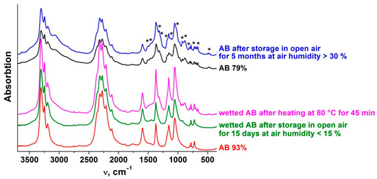 The ATR FTIR data are in full agreement with the results of the 11B MAS NMR spectroscopy. From Figure 3, it is seen that ammonia borane is, indeed, stable towards the action of moisture. The spectrum of the AB grains which were wetted by water and kept for 15 days in the open air at a humidity not higher than 15% practically coincides with the spectrum of the initial hydride described in [2,24,25]. Artificial ageing of ammonia borane by its longer contact with the open-air moisture (five months at a humidity of higher than 30%) and by heating of water-wetted grains of AB led to the appearance of new absorption bands (a. b.) in the IR spectra of the samples. It should be noted that the set of the a. b., appearing upon the AB interaction with water, was the same in all cases under study, and was in full agreement with the additional absorption bands observed in the spectrum of the stored AB 79% sample in Figure 3.
