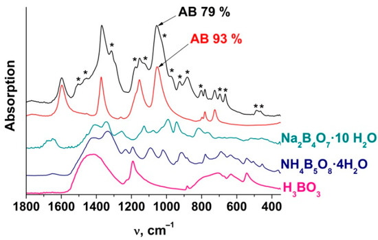 Attenuated total reflection Fourier transform infrared spectroscopy (ATR FTIR) was performed on an Agilent Cary 600 (Agilent Technologies, Santa Clara, CA, USA) spectrometer equipped with a Gladi ATR (PIKE Technologies, Madison, WI, USA) attachment in the range of 300–4000 cm−1 without pretreatment of the samples. The reagents H3BO3 (GOST 9656-75, Reahim, Moscow, Russia), Na2B4O7·10H2O (GOST 4199-76, Ecros, St. Petersburg, Russia), and NH4B5O8·4H2O (CAS 12229-12-8, Vecton, St. Petersburg, Russia) were used as model compounds.