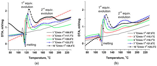 DTA curves for 93% (a) and 79% (b) pure samples of NH3BH3 obtained at the rates of heating from 1 to 10 °C/min. Also shown are the temperatures of the maxima corresponding to the first stage of ammonia borane dehydrogenation (1).