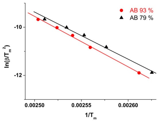 In Figure 6, the linear dependences in the coordinates of the Kissinger Equation (4) are shown. The calculated values of the apparent activation energy (Ea) for the samples AB 93% and AB 79% are 174 ± 5 kJ/mol and 163 ± 7 kJ/mol, respectively. The values of the pre-exponential factor (A0, min−1) are 8.30700 × 1022 (±0.1 × 106) for AB 93% and 0.29295 × 1022 (±0.2 × 106) for AB 79%. Note that the values Ea ~ 160–180 kJ/mol have also been reported in other studies devoted to solid-state AB dehydrogenation [11,28,29,30,31]. The obtained values of the apparent energy of activation are in good agreement with the value of 161 ± 7 kJ/mol given in our previous study [14], where the kinetic curves of hydrogen release in the thermolysis of a mixture of 87% pure AB with quartz sand under the isothermal conditions (85–99 °C) were described by the empirical Avrami-Erofeev Equation. Note that the calculated values of the activation energy for the monomolecular and intermolecular stages of dehydrogenation are 161.1 and 149.9 kJ/mol, respectively. These energy barriers exceed the energy needed for the cleavage of the B–N bond (120.5 kJ/mol), which indicates that the reaction takes a complex pathway [5].