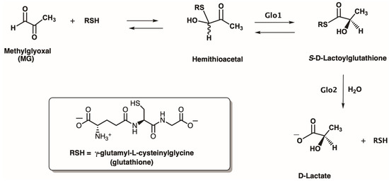 - Honek, J.F. Glyoxalase biochemistry. Biomol. Concepts 2015, 6, 401–414. [Google Scholar] [CrossRef] [PubMed]