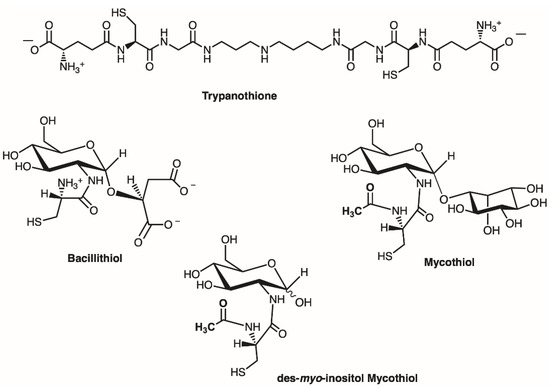 - Jothivasan, V.K.; Hamilton, C.J. Mycothiol: Synthesis, biosynthesis and biological functions of the major low molecular weight thiol in actinomycetes. Nat. Prod. Rep. 2008, 25, 1091–1117. [Google Scholar] [CrossRef]