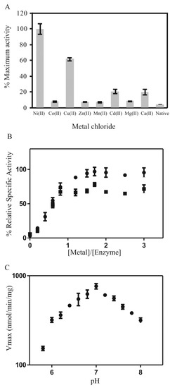 ) Cu2+; (C) pH dependency of PDO (3.125 µg in 200 µL assay; 5 equivalents NiCl2) with the substrate MG-tMSH (0.5 mM, Kd = 3.3 mM) that was incubated for 30 min in potassium phosphate buffer at various pH (5.8–8) at 25 °C.
