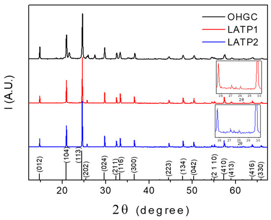 XRD patterns of the prepared Li-NASICON Li1.3Al0.3Ti1.7(PO4)3 LATPT1 and LATPT2 films, and the OHGC are included in Figure 1. The main peaks found in these patterns correspond to the Li-NASICON R-3C phase. In the 2θ (26°–29°) interval, small peaks of the secondary phase LiTiPO5 can be detected (see inset of the two films). Besides the mean peaks, the XRD pattern of the commercial OHGC sample shows the presence of an appreciable quantity of the AlPO4 secondary phase.