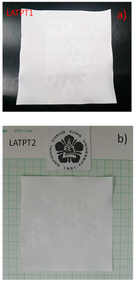 Figure 2. Photographs of the prepared self-supported thick films. (a) LATPT1 and (b) LATPT2 samples aspect. The size of the prepared thick films is 5.5 × 5.5 cm2, with an average thickness of 255 µm.