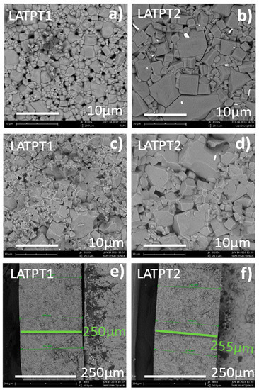 The microstructure of the surface, fresh fracture, and transversal section of the LATPT1 sample are depicted in Figure 3a,c,e, respectively, and those of the LATPT2 are depicted in Figure 3b,d,f, respectively. From Figure 3a,b, it is clear that the LATPT2 sample presents a larger grain size than the LATPT1 sample. In both cases, the large grain coexists with the smaller ones in a kind of a bi-modal microstructure. The difference in the preparation procedure (sintering time) produces a change in the microstructure, increasing the average grain size for both the large and small grains of the bi-modal grain distribution. In the LATPT2 sample, the grain facets are better defined. Some cracks in the grains can also be seen in the micrograph of the LATPT2 sample. The calculation of porosity after the digitalization/binarization of the micrographs gives a value close to the 28% ± 2% (open porosity). The microstructure found out in the fresh fracture showed, in some regions, clean boundaries even with crystallite facets. This observation justifies the poor sintering achieved, which affects the mechanical and electrical properties of samples.