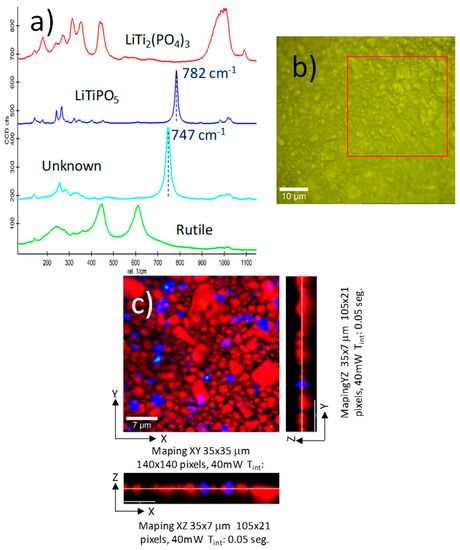 In Figure 4b, the optical microscope image of the analyzed sample surface is illustrated. The Z/X and Z/Y profiles (measured sweep area) are visualized in Figure 4, where a sample in deep information is also given. The obtained results are included in Figure 4c. From this plot, it can be inferred that the main phase is the Li-NASICON (62%), with a significant amount of LiTiPO5 secondary phase (9%; deep blue), a small quantity of unknown secondary phase (1%; light blue), and traces of Rutile (green; 0.3%). The light blue secondary phase has a similar RAMAN spectrum, with a displacement to lower energy of the main band. This peak was assigned to the Ti–O–Ti bond, and it did not move with the degree of Li insertion [25]. The softening of this band should be related to changes in this bond, maybe the inclusion of some amount of Al3+ replacing Ti4+ in the phase. The main secondary phase is also observable in the profile maps, (Z/X and Z/Y), showing a particle size similar to the NASICON particles.