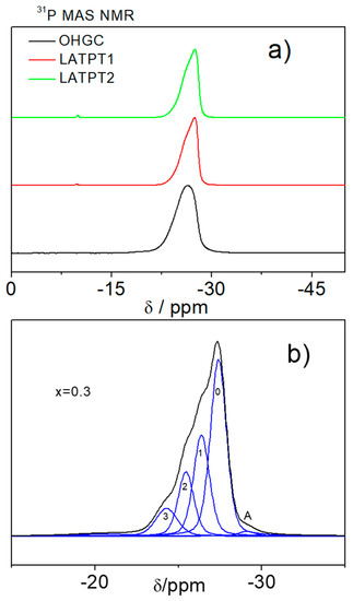 The experimental envelope at −26 ppm was deconvoluted with the DMFIT software that reproduces the positions, line widths, and integrated intensities of the Lorentzian/Gaussian (L/G) components. The deconvolution of this band was done using four equally spaced components of the same line-width, ascribed to P(OTi)4−n(OAl)n environments of NASICON phases (Figure 5b).
