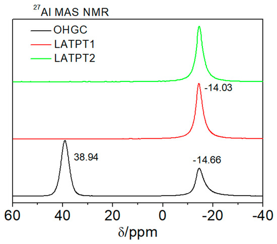 Figure 6. 27Al MAS-NMR spectra of the commercial OHGC, LATPT1, and LATPT2 thick film samples. The bands detected at approximately −14 and 40 ppm correspond to the octahedral and tetrahedral aluminum, respectively. Referred to 1M AlCl3 aqueous solution (δ = 0 ppm), resonant frequency 104.26 MHz.