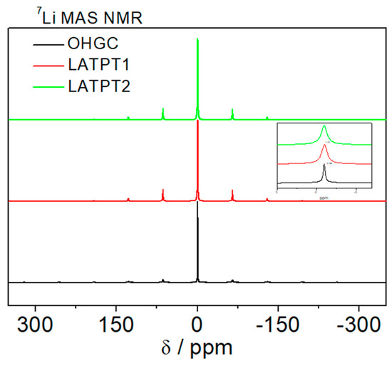 Figure 7. 7Li MAS-NMR spectra of commercial OHGC, LATPT1, and LATPT2 thick films samples. The central components are represented in the insert. Referred to 1 M LiCl aqueous solution (δ = 0 ppm), resonant frequency 155.45 MHz.