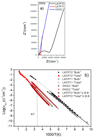 Figure 8. (a) Nyquist plots of the electrical impedance response of the samples of this work at 295 K. LATPT1 (red line), LATPT2 (black line), OHGC (blue line). (b) Arrhenius plot of the samples “bulk” direct current (DC) conductivity and total (“bulk” plus grain boundary contributions) DC conductivity. The meaning of the symbols is depicted in the plot legend. (U.B.B.) stands for ultra-broad-band.