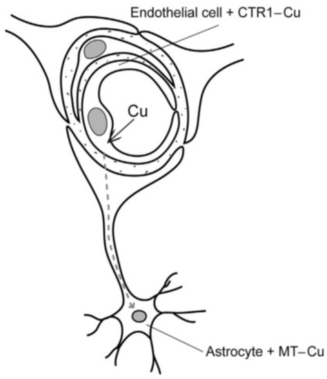 The BBB (Figure 1) exerts a selective discrimination for copper at the level of the cerebral microvascular endothelium. This consists of a non-fenestrated capillary endothelium that, with adhering pericytes and astrocyte end feet on the abluminal surface, constitutes a unique neurovascular unit [17]. Astrocytes are considered an integral feature of copper homeostasis in the brain, since it has been shown that excess copper is stored in these cells bound to metallothionien [18,19,20]. Furthermore, the strategic localization of astrocytes makes them ideally positioned to regulate the transport of copper from the BBB to neuronal cells [11]. The BBB is concerned mainly with copper influx mediated by CTR1 [11,14,20], from which it is transferred via ATP7A directly into the brain for neuronal activities [14], or taken up by astrocyte end feet, stored, and later released into neurons as required [11].