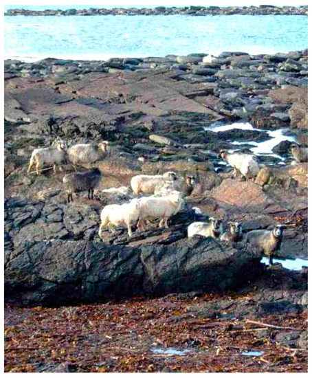 North Ronaldsay (NR) sheep on island foreshore. NR sheep have adapted to survive on seaweed which is very low (<5 ppm) in copper.