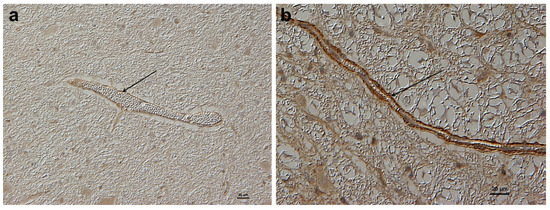 Comparison of CTR1 expression in BBB of adult sheep cerebellum of both domesticated and feral North Ronaldsay sheep. (a) Domesticated sheep (control) cerebellum (Cu 15.4 (µg/g) showing weak CTR1 expression in brain capillary of the BBB (arrow). (b) North Ronaldsay sheep cerebellum (Cu 35.0 (µg/g) showing strong CTR1 expression in capillary endothelium of BBB (arrow). Immunostain for CTR1 [26,27]. (Reproduced with permission from Haywood, J. Comp. Path.; published by Elsevier Ltd, 2013).