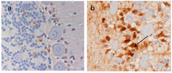 Comparison of MT expression in BBB of adult sheep cerebellum of both domesticated and feral North Ronaldsay sheep. (a) Control sheep cerebellum (Cu 15.4 µg/g) with weak MT immunostaining of astrocytes. (b) North Ronaldsay sheep cerebellum (Cu 35.0 µg/g) showing strong MT (Cu-MT) staining of astrocytes (arrow). (Zn remained unchanged [18]). (Reproduced with permission from Haywood, J. Comp. Path.; published by Elsevier Ltd, 2013).