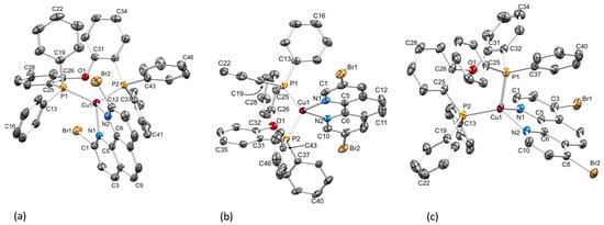 The structures of the POP-containing cations with H atoms omitted. (a) [Cu(POP)(2,9-Br2phen)]+ (ellipsoids plotted at 50% probability), (b) [Cu(POP)(3,8-Br2phen)]+ (ellipsoids plotted at 40% probability) and (c) [Cu(POP)(4,7-Br2phen)]+ (ellipsoids plotted at 50% probability). In [Cu(POP)(2,9-Br2phen)][PF6]·0.5Et2O and [Cu(POP)(4,7-Br2phen)][PF6]·CH2Cl2, there are two independent ions pairs in the asymmetric unit and only one cation is shown (see also Table 1 and the accompanying discussion).