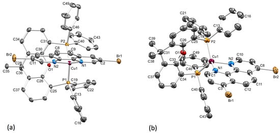 Yellow single crystals of [Cu(POP)(2,9-Br2phen)][PF6]·0.5Et2O, [Cu(POP)(3,8-Br2phen)][PF6]·0.8CH2Cl2·0.9H2O, [Cu(POP)(4,7-Br2phen)][PF6]·CH2Cl2, [Cu(xantphos)(2,9-Br2phen)][PF6]·1.1CH2Cl2, [Cu(xantphos)(3,8-Br2phen)][PF6]·1.1CH2Cl2·0.7Et2O and [Cu(xantphos)(4,7-Br2phen)][PF6]·CH2Cl2·0.9Et2O were grown from CH2Cl2 solutions of the compounds layered with Et2O. In [Cu(xantphos)(2,9-Br2phen)][PF6]·1.1CH2Cl2, the xantphos ligand is disordered and has been modelled over two sites of equal occupancies, the sites of the xanthene unit being related by a mirror plane. The asymmetric unit contains half of the 2,9-Br2phen ligand and the second half is generated by a mirror plane. Associated with this is the disorder of three of the four phenyl rings of the PPh2 units. Because of the extent of disorder, we will not discuss this structure in detail but merely comment that it provides confirmation that the 2,9-Br2phen ligand is present in a chelating mode despite the steric hindrance of the two bromo-substituents adjacent to the N-donors. The structures of the [Cu(P^P)(N^N)]+ cations in the remaining structures are displayed in Figure 2 and Figure 3. A comparison of the Cu–N and Cu–P bond lengths and of the N–Cu–N and P–Cu–P bond angles is provided in Table 1. Because of the rigidity of the chelating phen unit, the N–Cu–N angle is close to 80° in all structures. The POP ligand is conformationally flexible and the P–Cu–P bond angle ranges from 118.00(3)° to 112.37(2)°, the angle becoming smaller along the series 2,9-Br2phen > 3,8-Br2phen > 4,7-Br2phen (Table 1). The same trend is observed for the xantphos-containing cations, although the range of angles is smaller (Table 1). The distorted 4-coordinate geometry of the copper(I) atom in each complex cation is typical of heteroleptic [Cu(P^P)(N^N)]+ complexes. Using Houser’s τ4 parameter [28], the values of 0.83 to 0.88 (Table 1) illustrate distortion towards C3v symmetry for which τ4 = 0.85; for Td symmetry, τ4 = 1.00. We note that the unit cell dimensions for [Cu(POP)(2,9-Br2phen)][PF6]·Et2O (see the Materials and Methods section) are very similar to those reported for [Cu(POP)(2,9-Me2phen)][PF6]·Et2O [29] (Cambridge Strucural Database, CSD, refcode CAPZID [30]).