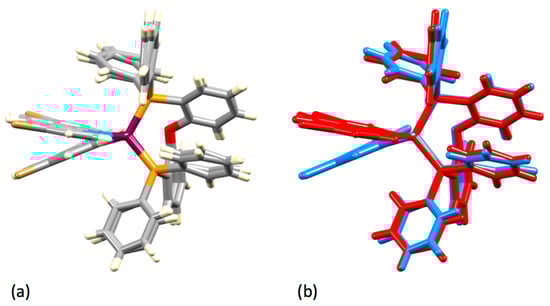 Overlay of the two independent cations in [Cu(POP)(4,7-Br2phen)][PF6]·CH2Cl2: (a) coloured by element colour, and (b) coloured to show the individual cations.