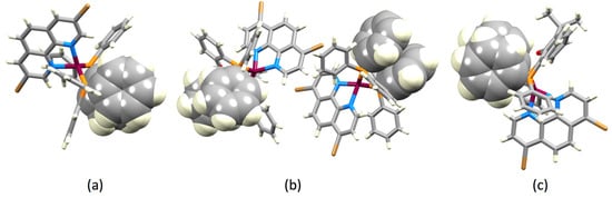 Space-filling representations of the π-stacking between one phenyl ring of a PPh2 unit and one arene ring of the POP backbone in (a) [Cu(POP)(3,8-Br2phen)]+ and (b) the independent [Cu(POP)(4,7-Br2phen)]+ cations. (c) Space-filling representation of the π-stacking between two phenyl rings of different PPh2 units in [Cu(xantphos)(4,7-Br2phen)]+.