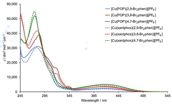 The absorption spectra of CH2Cl2 solutions of the copper(I) compounds are shown in Figure 7 and absorption maxima are given in Table 3. The high energy absorptions (λ < 345 nm) are assigned to ligand-centred, spin-allowed transitions. The broad absorption bands with λmax in the range 415–420 nm (Table 3) arise from metal-to-ligand charge transfer (MLCT). The profile of the absorption spectrum of [Cu(xantphos)(3,8-Br2phen)][PF6] is consistent with that reported for the corresponding perchlorate salt [26]. For both the POP- and xantphos-containing complexes, Figure 7 illustrates an increase in values of εmax on going from 2,9-Br2phen to 3,8-Br2phen to 4,7-Br2phen.