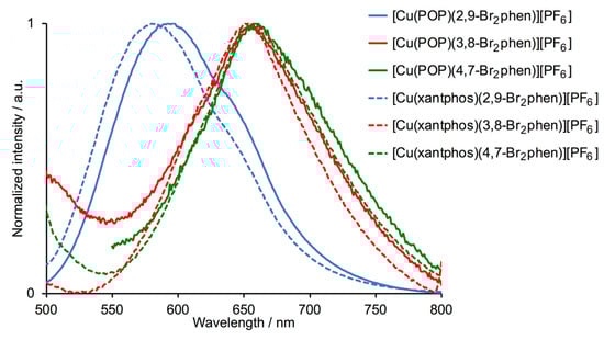 When excited into the MLCT region, deaerated CH2Cl2 solutions of the copper(I) compounds are weak yellow or orange emitters. Solution emission spectra are displayed in Figure 8 and the emission maxima are given in Table 4. All solution PLQYs were <1%. By analogy with other [Cu(P^P)(N^N)]+ complexes [14], the emissions are assigned to dπ(Cu)→π*(diimine) (3MLCT) transitions. For [Cu(POP)(2,9-Br2phen)][PF6] and [Cu(xantphos)(2,9-Br2phen)][PF6], there is a significant blue-shift in the emission (λemmax = 596 and 582 nm, respectively) compared to the compounds with 3,8-Br2phen and 4,7-Br2phen (λemmax is between 653 and 660 nm). This indicates a higher energy MLCT excited state for the 2,9-Br2phen-containing complexes and is consistent with the higher oxidation potentials discussed above (Table 2). The emission maxima of 596 and 582 nm for [Cu(POP)(2,9-Br2phen)][PF6] and [Cu(xantphos)(2,9-Br2phen)][PF6], respectively, are similar to λemmax = 570 nm for [Cu(POP)(2,9-Me2phen)][BF4] in CH2Cl2 at room temperature [31]. However, the solution PLQY of [Cu(POP)(2,9-Me2phen)][BF4] of 15% is significantly higher than PLQYs of [Cu(POP)(2,9-Br2phen)][PF6] and [Cu(xantphos)(2,9-Br2phen)][PF6]. It is well established that the presence of sterically demanding substituents in the phen ligand are critical for suppressing exciplex quenching [31], but the similarities in the crystal structures of [Cu(POP)(2,9-Br2phen)][PF6]·Et2O and [Cu(POP)(2,9-Me2phen)][PF6]·Et2O (see earlier discussion) indicate that steric effects are unlikely to be the cause of the low PLQYs for the 2,9-Br2phen-containing compounds. It is also worth noting that Pellegrin, Daniel and coworkers reported that solution PLQYs for homoleptic [Cu(2,9-X2phen)2][PF6] (X = Cl, Br, I) are higher than that of Cu(2,9-Me2phen)2][PF6] and conclude that this is “difficult to rationalize only on steric grounds” [27].