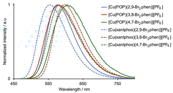 Powdered samples of all the [Cu(POP)(N^N)][PF6] and [Cu(xantphos)(N^N)][PF6] compounds are yellow or orange emitters when excited at 365 or 340 nm, with values of λemmax in the range 554–604 nm (Table 4 and Figure 9). The value of λemmax = 598 nm for [Cu(xantphos)(3,8-Br2phen)][PF6] appears to be red-shifted with respect to that reported for solid [Cu(xantphos)(3,8-Br2phen)][ClO4] (λemmax = 565 nm) [26], and may reflect differences in solid-state packing interactions. Each solid-state emission maximum is blue-shifted with respect to solution (Table 4) and this is typical of most other heteroleptic [Cu(P^P)(N^N)]+ complexes [14,16]. As in solution, values of λemmax for solid-state [Cu(POP)(2,9-Br2phen)][PF6] and [Cu(xantphos)(2,9-Br2phen)][PF6] are blue-shifted with respect to compounds with the 3,8- and 4,7-isomers, although the effect is less pronounced for the powders. The solid-state PLQY values are highest for the complexes containing the 2,9-Br2phen ligands (24% for [Cu(POP)(2,9-Br2phen)][PF6] and 45% for [Cu(xantphos)(2,9-Br2phen)][PF6]) and these values are lower than PLQYs of 66% and 88% for [Cu(POP)(2,9-Me2phen)][BARF] and [Cu(xantphos)(2,9-Me2phen)][BARF] ([BARF]– = tetrakis [3,5-bis(trifluoromethyl)phenylborate]) [32]. For comparison, a PLQY of 36.6% (λemmax = 566 nm) has been reported for powdered [Cu(POP)(phen)][BF4] and the excited-state lifetime of 12.75 μs for the latter [11] is similar to τ1/2 = 9.9 μs of [Cu(xantphos)(2,9-Br2phen)][PF6]. Thus, the data indicate that the incorporation of the bromo-substituents in the 2,9-positions is less beneficial than the presence of methyl groups.