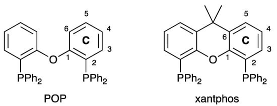Structures of POP and xantphos. Atom labels are used for the NMR spectroscopic assignments; phenyl rings in the PPh2 units are labelled D, and ring labels are consistent with our previous publications in this area.