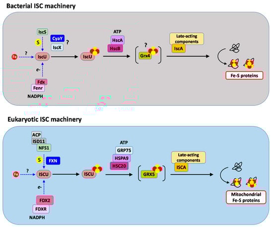 Main components of the bacterial and eukaryotic ISC machineries. The bacterial ISC machinery encompasses proteins encoded by the ISC operon (IscU, IscS, IscX, Fdx, HscA, HscB and IscA), as well as CyaY, Fenr, Grx4 and several late-acting components. Fe–S clusters are assembled on the IscU scaffold; iron is provided to IscU by a still ill-defined iron chaperone; sulfur is provided by the cysteine desulfurase IscS, and its activity is modulated by CyaY and IscX; and electrons are provided by Fdx that is reduced by the flavodoxin/ferredoxin NADP reductase (Fenr). The [2Fe2S] cluster formed on IscU is transferred to late-acting components by the ATP-dependent chaperone/co-chaperone HscA/HscB. Grx4 may function as a relay to late-acting components among which is the IscA proteins that have specialized functions in the assembly of [4Fe4S] clusters and/or insertion of [2Fe2S] and [4Fe4S] clusters into recipients’ enzymes. In the eukaryotic ISC machinery, Fe–S clusters are assembled on the ISCU scaffold, iron is provided to ISCU by a still ill-defined iron chaperone, sulfur is provided by the cysteine desulfurase complex NFS1–ISD11–ACP, and electrons are provided by FDX2 that is reduced by the NADPH-dependent ferredoxin reductase FDXR. Binding of ISD11–ACP to NFS1 maintains NFS1 in a soluble form. FXN stimulates the whole process by acting on the sulfur donation step. The [2Fe2S] cluster formed on ISCU is transferred to late-acting components by the ATP-dependent chaperone/co-chaperone HSPA9/HSC20 with assistance from the nucleotide exchanger GRP75. GRX5 serves as a relay to late-acting components. The late-acting components, including ISCA, have specialized functions in the assembly of [4Fe4S] clusters and insertion of [2Fe2S] and [4Fe4S] clusters into recipients’ enzymes. The dashed blue arrows describe the supply of each element needed to build a Fe–S cluster (iron, sulfur and electrons) and the proteins involved at these steps, without assumption on the sequence order and coordination between these singular steps. The solid black arrows describe actual sequence for Fe–S cluster biogenesis and transfer.