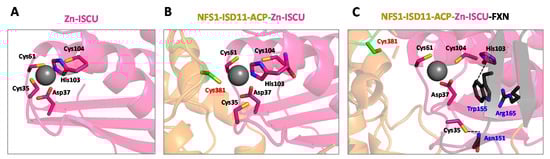 Structural rearrangement at the zinc site of ISCU upon binding of NFS1 and FXN. Zoom on the zinc site of (A) mouse ISCU (nuclear magnetic resonance (NMR) structure, PDB code 1WFZ) and in the human NFS1–ISD11–ACP–ISCU complex (B) without FXN (X-ray structure PDB code 5WLW) [] and (C) with FXN (CryoEM structure PDB code 6NZU) []. ISCU and some of its key amino acids (Cys35, Asp37, Cys61 and His 103) are colored in pink, NFS1 is in yellow with its catalytic cysteine (Cys381) in green and FXN with its key amino acids (Asn151, Trp155 and Arg165) are in black. The dashed black line represents π staking between Trp155 and His103. The zinc ion is initially coordinated by Cys35, Asp37, Cys61 and His103 in ISCU. Upon binding to NFS1, the catalytic cysteine of NFS1, Cys381, binds to the zinc ion via exchange with Cys35. FXN binds to the NFS1–ISD11–ACP–ISCU complex and pushes aside His103 and Cys35 of ISCU via interactions with Trp155 and Asn151, respectively, thereby uncovering Cys104.