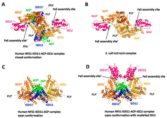 Structures of the human NFS1–ISD11–ACP–ISCU and E. coli IscS–IscU complexes. X-ray structures of (A) human NFS1–ISD11–ACP–ISCU complex in the closed conformation (PDB code 5WLW) [], (B) E. coli IscS–IscU complex (PDB code 3LVL) [], (C) human NFS1–ISD11–ACP complex in the open conformation (PDB code 5USR) [] and (D) human NFS1–ISD11–ACP complex in the open conformation (PDB code 5USR) with the human ISCU proteins modeled according to the structure of the NFS1–ISD11–ACP–ISCU complex (PDB code 5WLW). The labels for the ACP protein have been omitted for clarity in D. IscS/NFS1 are colored in orange, IscU/ISCU in pink, ISD11 in blue and ACP in green. The pyridoxal phosphate (PLP)-binding sites, the phosphopantetheine with its fatty acyl chain (PPA) and the Fe–S cluster assembly sites of IscU/ISCU are indicated by arrows.