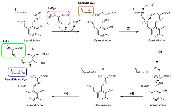 While the mechanism of sulfur delivery clearly differentiates class I and II cysteine desulfurase, the mechanism of desulfurization is similar for both enzymes []. This mechanism relies on catalysis by the PLP cofactor which operates as an electron withdrawal group facilitating the elimination of sulfur on l-cysteine (Figure 4). The PLP cofactor is anchored to the enzyme via the side chain of a lysine through formation of an imine link, also called internal aldimine. The amino group of the l-cysteine substrate binds to the PLP by exchange with the amine of the lysine to form an external aldimine. This intermediate is converted into a ketimine in which a double bond is created between the enantiomeric α carbon of l-cysteine and its amino group. Then, the sulfur of l-cysteine is eliminated and “transferred” to the catalytic cysteine of the cysteine desulfurase, which leads to formation of a persulfide (-SSH) and creation of a double bond between the α and β carbon of the l-cysteine. Upon hydrolysis, alanine is released and a new cycle is initiated. Formally, a sulfanium cation (HS+) is abstracted by the thiolate group of the catalytic cysteine. This formal description suggests that the reaction is an oxido-reduction process. The redox state of the terminal sulfur (also called sulfane sulfur) is commonly assumed to be “0” while the sulfur of the cysteine to which it is bound would stay at the −II redox state. However, this description is not correct since two identical atoms that are covalently attachedhave their redox state mutually affected and equals, as found in disulfides (RSSR’) and hydroperoxides (ROOH) in which the sulfur and oxygen atoms are at the same −I redox state. Thereby, the formal redox states of the sulfurs in a persulfide are better described as −I for both of them, which indicates that the sulfur of l-cysteine is oxidized during the reaction and consequently the carbon carrying the sulfur of l-cysteine is reduced from −I to −III in l-alanine (Figure 4, red labels).