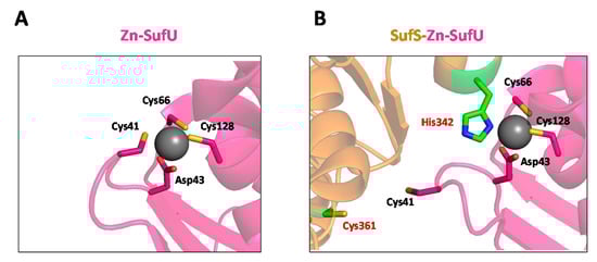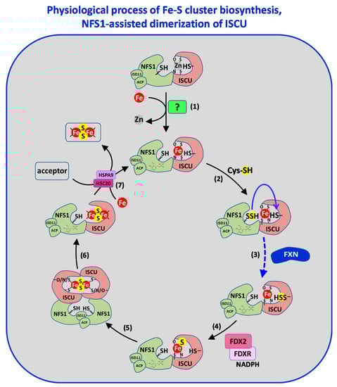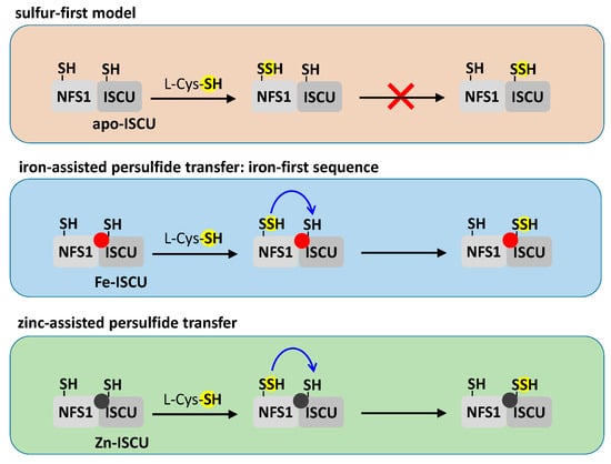 Interestingly, with the mouse system it was shown that in the absence of iron, the transfer of persulfide is abolished, which points to a metal-dependent process []. A similar iron-dependent persulfide transfer process was recently reported with the E. coli system []. Thus, the presence of iron is required to allow the transfer of persulfide, which experimentally confirms the iron-first model that was earlier proposed and discards the sulfur-first hypothesis (Figure 5). Surprisingly, persulfide transfer to ISCU is also enabled when zinc is in the assembly site, which is probably related to the identical coordination mode of iron and zinc in ISCU (Figure 5). This may indicate a physiological role for zinc as proposed for the zinc ion of SufU, a closely related homolog of IscU/ISCU (see Section 5.3.3) []. Moreover, the iron-like effect of zinc may explain the initial controversy in the models of iron and sulfur insertion sequences. Since zinc was likely present in the preparations of IscU, although its presence was not assessed [,,], it has probably allowed persulfide transfer in the absence of iron and misled the authors to the conclusion that sulfur comes first.