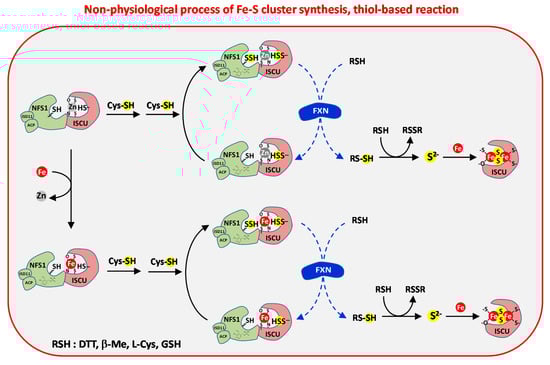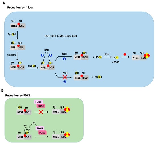Thiols, essentially dithiothreitol (DTT), but also GSH and cysteine were extensively used as reductants in Fe–S cluster reconstitution studies [,,,,,,,]. However, their mode of action was not thoroughly investigated until recently. Using the mouse ISC system, our group reported that thiols are able to release sulfide by direct reduction of the persulfide of NFS1, but are poorly efficient to reduce the persulfide transferred to ISCU, probably due to the presence of the metal that shields the receptor cysteine Cys104 []. The reduction of the persulfide of NFS1 by thiols occurs in reaction performed with excess of l-cysteine relative to the NFS1–ISCU complex (Figure 6A). Under these conditions, a persulfide is formed on NFS1 that is transferred to ISCU, then a new persulfide is formed on NFS1 that cannot be transferred to ISCU since it is already persulfidated, which leads to a complex persulfidated on both, NFS1 and ISCU. Since thiols react faster with NFS1 than with ISCU, this leads to preferential reduction of the persulfide sitting on NFS1. Thereby, the prominent source of sulfide ions in thiol-based reconstitution is NFS1 not ISCU. This reduction proceeds in two steps: (1) trans-persulfuration of the thiol leading to a persulfidated thiol (RSSH) and (2) cleavage of the S–S bond of the persulfidated thiol by another thiol molecule (Figure 6A). The sulfide ion then combined with iron to form a Fe–S cluster. The thiol-based reactions indiscriminately lead to formation of both [2Fe2S] and [4Fe4S] clusters with variable proportions [,,,,,]. DTT further enhances the proportion of [4Fe4S] cluster versus [2Fe2S] and also generates high-molecular-weight (HMW) Fe–S minerals []. This was attributed to the ability of DTT to stimulate the rate of sulfide release more strongly than l-cysteine, thereby creating a bulk of sulfide that reacts with [2Fe2S] clusters to generate [4Fe4S] clusters and eventually forms HMW Fe–S minerals. Surprisingly, the thiol-based reconstitution is also operative when zinc is present in the assembly site of ISCU, but is much slower probably due to hindrance of Fe–S cluster formation by the zinc ion [].
