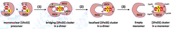 The last step, after reduction of the persulfide, is the formation of the [2Fe2S] cluster. This requires formation of a dinuclear iron center with a di-µ-sulfido bridge. Since the titration of persulfides with the mouse system point to the formation of a mononuclear [1Fe1S] iron–sulfide complex, dimerization of IscU/ISCU is likely an obligatory step to form the dinuclear [2Fe2S] cluster (Figure 7). The dimerization would generate a bridged [2Fe2S] cluster, as observed with glutaredoxins that are involved in Fe–S cluster transfer [,,,]. In the reconstitutions performed with C. thermophilum Isu1, the final product was a [2Fe2S] cluster in a dimer of Isu1. However, this stoichiometry is also consistent with an asymmetric configuration in which only half of the subunits are occupied []. In contrast, a monomer of ISCU carrying one [2Fe2S] cluster has been identified by native mass spectrometry and Mössbauer spectroscopy as the final product in reconstitution assays performed with the mouse ISC system []. Therefore, if a bridged [2Fe2S] cluster is formed, it is a transient species that rapidly relocates on one of the subunits (Figure 7) []. Then, the dimer dissociates to release the monomer of ISCU holding a [2Fe2S] cluster.