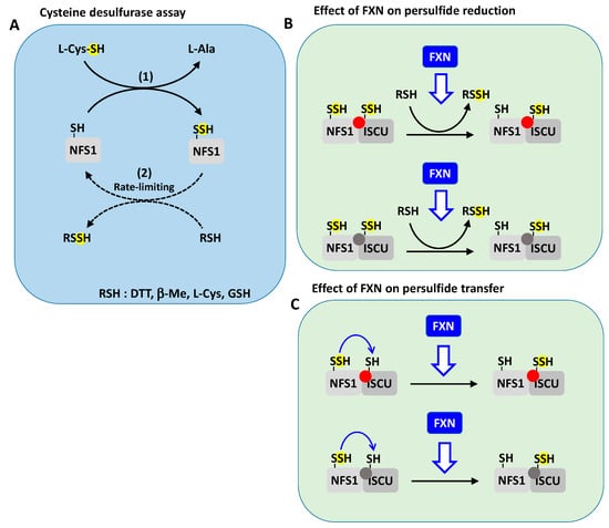 Several groups have thus studied the cysteine desulfurase activity in more details to determine the kinetic parameters of this reaction [,,,,,,,,]. Most of these assays were conducted in multiple turnover kinetics by monitoring the rates of sulfide or l-alanine productions in the presence of DTT to reduce the persulfide of NFS1 (Figure 8A) [,,,,,,,,]. In multiple turnover kinetics, the rate-limiting step (i.e., the slowest step) dictates the global rate of the reaction. As the cysteine desulfurase assay encompasses two main reactions: persulfide formation (Figure 8A, reaction 1) and persulfide reduction (Figure 8A, reaction 2), either of these reactions could be rate-limiting. In some studies, saturation behaviors were apparently observed upon increase of l-cysteine, which was interpreted as formation of a complex between l-cysteine and NFS1 for persulfide formation (Figure 8A, reaction 1) [,,,,,,]. Since l-cysteine was thought to be involved only at the first step, it was assumed that persulfide formation is the rate-limiting step. Thereby, the effects of FXN and CyaY were interpreted as a modulation of the rate of persulfide formation. The Michaelis–Menten formalism was applied and KM and kcat values were reported.