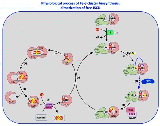 Altogether, the current data provide a more complete picture of the mechanism of Fe–S cluster assembly by the ISC machinery. Figure 9, Figure 10 and Figure 11 depict the models based on these data. Since most mechanistic information originates from the eukaryotic systems, essentially the mouse and human ones, the mammalian nomenclature is used here to describe the mechanisms. Nonetheless, several features of the bacterial machineries suggest that the mechanism of Fe–S cluster assembly is conserved across species. A first striking conclusion is that Fe–S clusters can be assembled via two different routes: the FDX2-based reaction that is physiologically relevant (Figure 9 and Figure 10) and the thiol-based one that is also productive of Fe–S clusters, but only in vitro and is thus not considered as physiologically relevant (Figure 11) []. The second breakthrough is the elucidation of the first steps of the FDX2-based reaction leading to production of the sulfide ions and its encounter with iron. The next steps are more elusive. The formation of a dinuclear [2Fe2S] cluster is supposed to rely on dimerization of ISCU and two mechanisms are postulated: either ISCU dimerizes within the complex with assistance from NFS1 (Figure 9) or the NFS1–ISCU complex dissociates and ISCU auto-dimerizes (Figure 10).