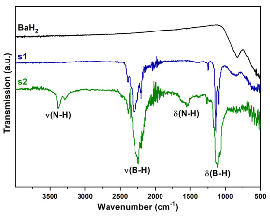 FT-IR spectra of BaH2, s1 (Ba(BH4)2) and s2 (Ba(BH4)2·2NH3).