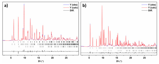 The crystal structures were solved and refined from SR-PXD data. Indexing of the unit cell was performed in the program FOX, using the method of “decomposition-aided indexing” [30,47]. From careful inspection of systematic absences, the space group was determined. The powder X-ray diffraction pattern was compared to possible isostructural compounds and Ba(BH4)2·2NH3 was found to be isostructural to Sr(BH4)2·2NH3, as confirmed by subsequent Rietveld refinement. The structure of Ba(BH4)2·NH3 was solved at T = 95 °C by ab initio structure solution by global optimization in direct space, as implemented in FOX. The structural models were refined by the Rietveld method in the program Fullprof, and were checked for higher symmetry using the ADDSYM procedure implemented in Platon [48,49].